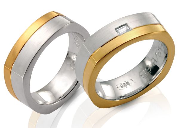Steidinger-Trauringe in einer leicht viereckigen Ringform aus 585 Weiß und Gelbgold.